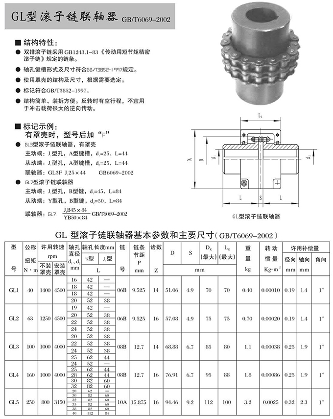 瑞安市寶德隆機械配件有限公司提供GL型滾子鏈聯軸器具有拆裝方便,快速安裝等特點,廣泛用于連接/固定輪轂孔和零件的軸,例如齒輪,錐齒輪,鏈輪,葉輪,凸輪,皮帶輪和飛輪等軸的聯結固定,咨詢電話:18906872378