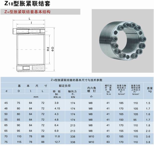 型號:Z18型脹套脹套能把較大配合間隙的軸轂結合起來,拆卸時將螺栓擰松,即可使被聯結件容易拆開。脹緊時,接觸面緊密億貼合不銹蝕,也便于拆開。